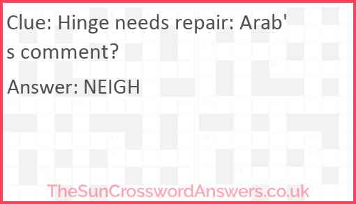 Hinge needs repair: Arab's comment? is a crossword clue for which we have 1 possible answer and we have spotted 3 times in our database. This crossword clue was last seen on 15 May 2025 in The Sun Cryptic Crossword puzzle!