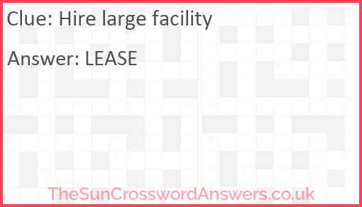 Hire large facility is a crossword clue for which we have 1 possible answer and we have spotted 2 times in our database. This crossword clue was last seen on 19 August 2021 in The Sun Cryptic Crossword puzzle!