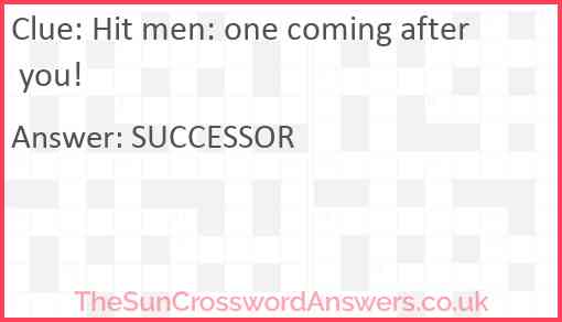 Hit men: one coming after you! is a crossword clue for which we have 1 possible answer and we have spotted 4 times in our database. This crossword clue was last seen on 20 June 2025 in The Sun Cryptic Crossword puzzle!