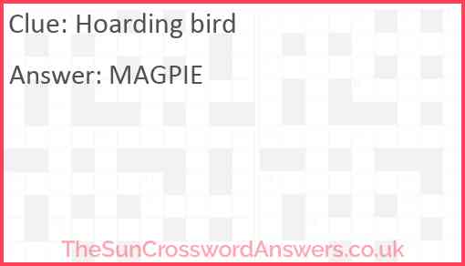 Hoarding bird is a crossword clue for which we have 1 possible answer and we have spotted 2 times in our database. This crossword clue was last seen on 04 March 2025 in The Sun Coffee Time Crossword puzzle!