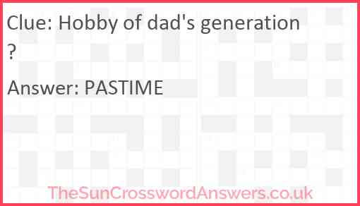 Hobby of dad's generation? is a crossword clue for which we have 1 possible answer and we have spotted 2 times in our database. This crossword clue was last seen on 27 September 2023 in The Sun Cryptic Crossword puzzle!
