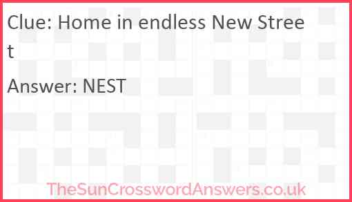 Home in endless New Street is a crossword clue for which we have 1 possible answer and we have spotted 2 times in our database. This crossword clue was last seen on 21 June 2025 in The Sun Cryptic Crossword puzzle!