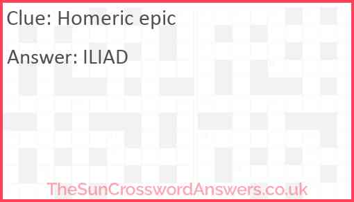 Homeric epic is a crossword clue for which we have 1 possible answer and we have spotted 17 times in our database. This crossword clue was last seen on 08 January 2025 in The Sun Coffee Time Crossword puzzle!