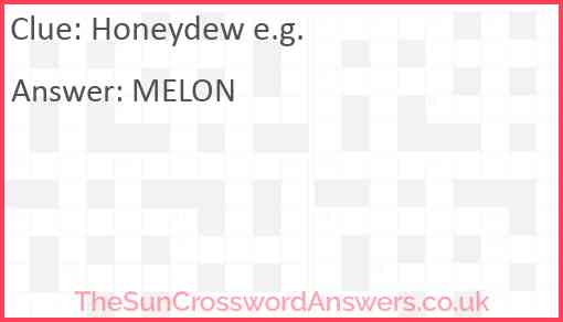 Honeydew e.g. is a crossword clue for which we have 1 possible answer and we have spotted 2 times in our database. This crossword clue was last seen on 30 October 2023 in The Sun Coffee Time Crossword puzzle!