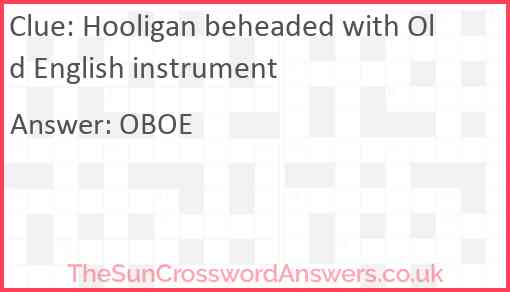 Hooligan beheaded with Old English instrument is a crossword clue for which we have 1 possible answer and we have spotted 4 times in our database. This crossword clue was last seen on 28 January 2023 in The Sun Cryptic Crossword puzzle!