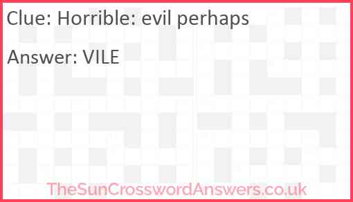 Horrible: evil perhaps is a crossword clue for which we have 1 possible answer and we have spotted 2 times in our database. This crossword clue was last seen on 20 September 2024 in The Sun Cryptic Crossword puzzle!