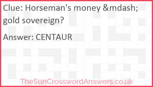 Horseman's money — gold sovereign? is a crossword clue for which we have 1 possible answer and we have spotted 1 times in our database. This crossword clue was last seen on 30 October 2019 in The Sun Cryptic Crossword puzzle!