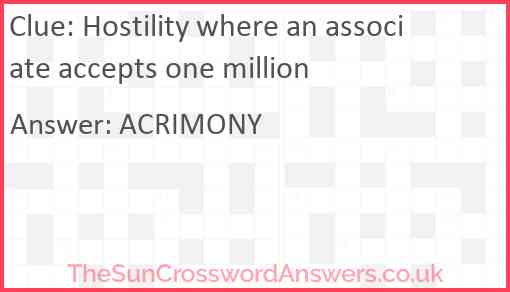 Hostility where an associate accepts one million is a crossword clue for which we have 1 possible answer and we have spotted 1 times in our database. This crossword clue was last seen on 07 June 2021 in The Sun Cryptic Crossword puzzle!