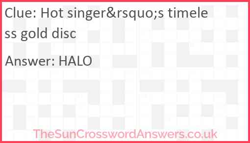 Hot singer’s timeless gold disc is a crossword clue for which we have 1 possible answer and we have spotted 1 times in our database. This crossword clue was last seen on 26 December 2021 in The Sun Cryptic Crossword puzzle!