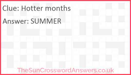 Hotter months is a crossword clue for which we have 1 possible answer and we have spotted 1 times in our database. This crossword clue was last seen on 22 March 2023 in The Sun Coffee Time Crossword puzzle!