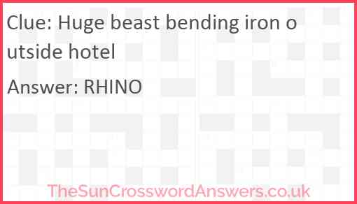 Huge beast bending iron outside hotel is a crossword clue for which we have 1 possible answer and we have spotted 3 times in our database. This crossword clue was last seen on 11 March 2023 in The Sun Cryptic Crossword puzzle!