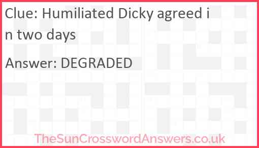 Humiliated Dicky agreed in two days is a crossword clue for which we have 1 possible answer and we have spotted 1 times in our database. This crossword clue was last seen on 27 December 2019 in The Sun Cryptic Crossword puzzle!
