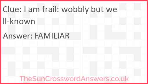 I am frail: wobbly but well-known is a crossword clue for which we have 1 possible answer and we have spotted 1 times in our database. This crossword clue was last seen on 28 June 2021 in The Sun Cryptic Crossword puzzle!