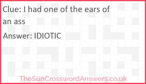 I had one of the ears of an ass is a crossword clue for which we have 1 possible answer and we have spotted 1 times in our database. This crossword clue was last seen on 28 January 2025 in The Sun Cryptic Crossword puzzle!
