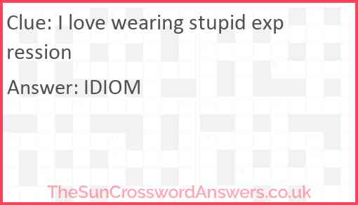 I love wearing stupid expression is a crossword clue for which we have 1 possible answer and we have spotted 3 times in our database. This crossword clue was last seen on 18 January 2023 in The Sun Cryptic Crossword puzzle!