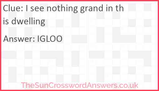 I see nothing grand in this dwelling is a crossword clue for which we have 1 possible answer and we have spotted 2 times in our database. This crossword clue was last seen on 12 August 2022 in The Sun Cryptic Crossword puzzle!