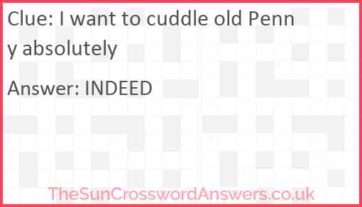 I want to cuddle old Penny absolutely is a crossword clue for which we have 1 possible answer and we have spotted 3 times in our database. This crossword clue was last seen on 08 March 2025 in The Sun Cryptic Crossword puzzle!
