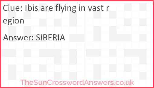 Ibis are flying in vast region is a crossword clue for which we have 1 possible answer and we have spotted 1 times in our database. This crossword clue was last seen on 19 November 2023 in The Sun Cryptic Crossword puzzle!