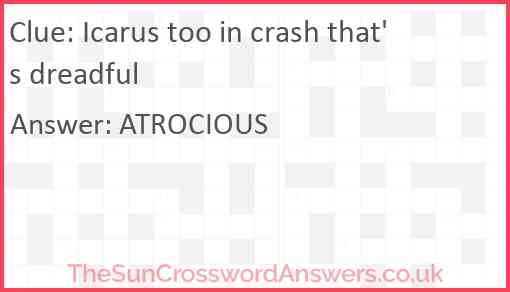 Icarus too in crash that's dreadful is a crossword clue for which we have 1 possible answer and we have spotted 3 times in our database. This crossword clue was last seen on 20 December 2024 in The Sun Cryptic Crossword puzzle!