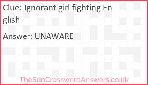 Ignorant girl fighting English is a crossword clue for which we have 1 possible answer and we have spotted 3 times in our database. This crossword clue was last seen on 03 October 2023 in The Sun Cryptic Crossword puzzle!