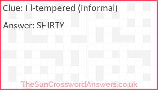 Ill-tempered (informal) is a crossword clue for which we have 1 possible answer and we have spotted 1 times in our database. This crossword clue was last seen on 05 February 2019 in The Sun Coffee Time Crossword puzzle!
