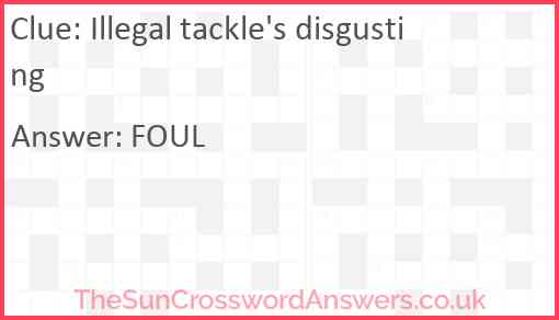 Illegal tackle's disgusting is a crossword clue for which we have 1 possible answer and we have spotted 1 times in our database. This crossword clue was last seen on 26 January 2020 in The Sun Cryptic Crossword puzzle!