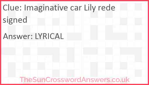 Imaginative car Lily redesigned is a crossword clue for which we have 1 possible answer and we have spotted 2 times in our database. This crossword clue was last seen on 05 May 2024 in The Sun Cryptic Crossword puzzle!