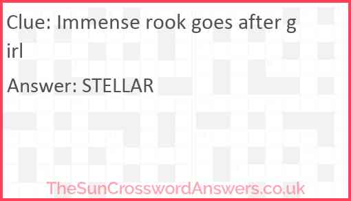 Immense rook goes after girl is a crossword clue for which we have 1 possible answer and we have spotted 3 times in our database. This crossword clue was last seen on 12 April 2025 in The Sun Cryptic Crossword puzzle!