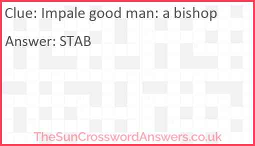 Impale good man: a bishop is a crossword clue for which we have 1 possible answer and we have spotted 3 times in our database. This crossword clue was last seen on 30 September 2023 in The Sun Cryptic Crossword puzzle!