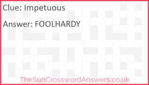 Impetuous is a crossword clue for which we have 3 possible answer and we have spotted 10 times in our database. This crossword clue was last seen on 27 July 2024 in The Sun Coffee Time Crossword puzzle!
