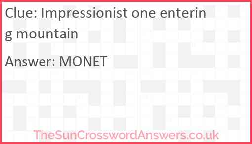 Impressionist one entering mountain is a crossword clue for which we have 1 possible answer and we have spotted 2 times in our database. This crossword clue was last seen on 18 June 2023 in The Sun Cryptic Crossword puzzle!