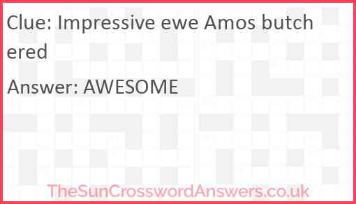 Impressive ewe Amos butchered is a crossword clue for which we have 1 possible answer and we have spotted 2 times in our database. This crossword clue was last seen on 15 October 2021 in The Sun Cryptic Crossword puzzle!