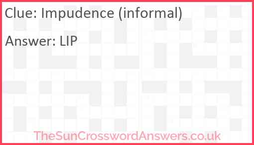 Impudence (informal) is a crossword clue for which we have 1 possible answer and we have spotted 1 times in our database. This crossword clue was last seen on 31 January 2020 in The Sun Coffee Time Crossword puzzle!