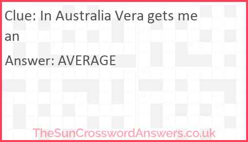 In Australia Vera gets mean is a crossword clue for which we have 1 possible answer and we have spotted 1 times in our database. This crossword clue was last seen on 26 December 2021 in The Sun Cryptic Crossword puzzle!