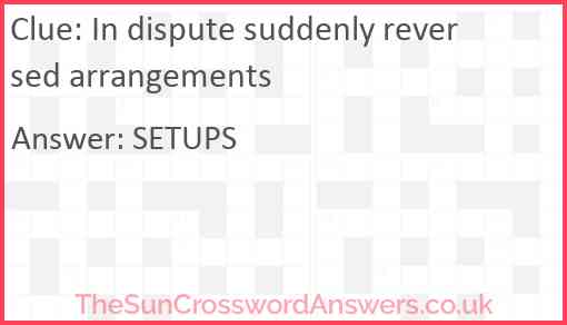 In dispute suddenly reversed arrangements is a crossword clue for which we have 1 possible answer and we have spotted 1 times in our database. This crossword clue was last seen on 31 October 2024 in The Sun Cryptic Crossword puzzle!