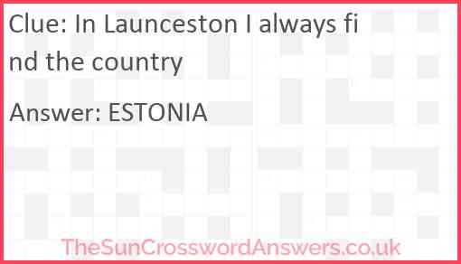 In Launceston I always find the country is a crossword clue for which we have 1 possible answer and we have spotted 1 times in our database. This crossword clue was last seen on 03 August 2024 in The Sun Cryptic Crossword puzzle!