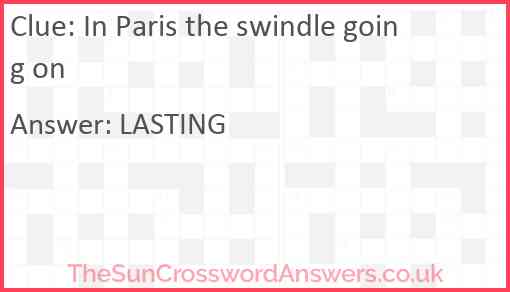 In Paris the swindle going on is a crossword clue for which we have 1 possible answer and we have spotted 1 times in our database. This crossword clue was last seen on 25 October 2021 in The Sun Cryptic Crossword puzzle!