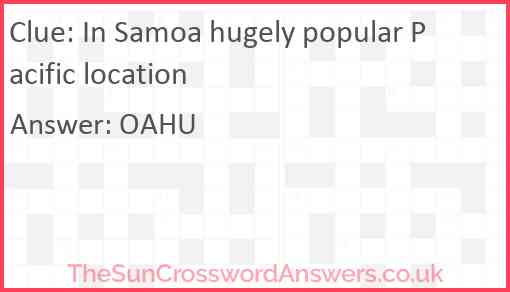 In Samoa hugely popular Pacific location is a crossword clue for which we have 1 possible answer and we have spotted 2 times in our database. This crossword clue was last seen on 15 September 2024 in The Sun Cryptic Crossword puzzle!