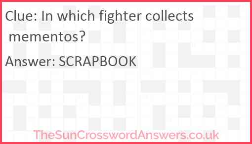 In which fighter collects mementos? is a crossword clue for which we have 1 possible answer and we have spotted 1 times in our database. This crossword clue was last seen on 28 March 2021 in The Sun Cryptic Crossword puzzle!