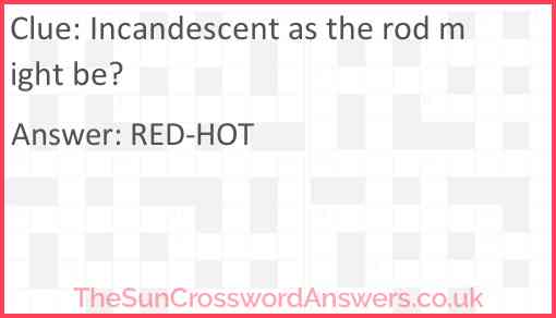 Incandescent as the rod might be? is a crossword clue for which we have 2 possible answer and we have spotted 2 times in our database. This crossword clue was last seen on 19 May 2022 in The Sun Cryptic Crossword puzzle!