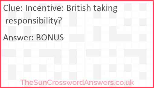Incentive: British taking responsibility? is a crossword clue for which we have 1 possible answer and we have spotted 3 times in our database. This crossword clue was last seen on 22 December 2024 in The Sun Cryptic Crossword puzzle!