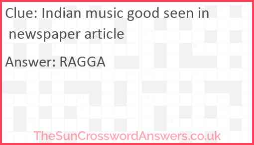 Indian music good seen in newspaper article is a crossword clue for which we have 1 possible answer and we have spotted 1 times in our database. This crossword clue was last seen on 11 March 2024 in The Sun Cryptic Crossword puzzle!