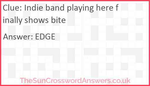 Indie band playing here finally shows bite is a crossword clue for which we have 1 possible answer and we have spotted 2 times in our database. This crossword clue was last seen on 26 January 2024 in The Sun Cryptic Crossword puzzle!