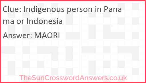 Indigenous person in Panama or Indonesia is a crossword clue for which we have 1 possible answer and we have spotted 2 times in our database. This crossword clue was last seen on 04 June 2024 in The Sun Cryptic Crossword puzzle!