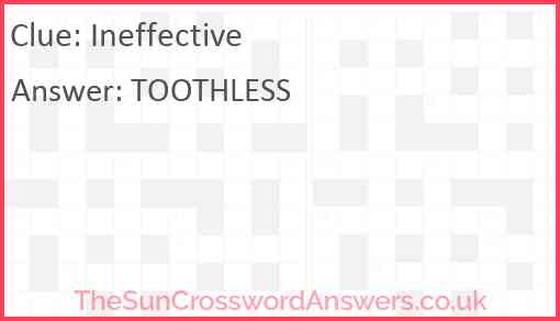 Ineffective is a crossword clue for which we have 1 possible answer and we have spotted 2 times in our database. This crossword clue was last seen on 25 January 2024 in The Sun Coffee Time Crossword puzzle!
