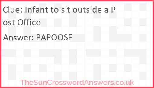 Infant to sit outside a Post Office is a crossword clue for which we have 1 possible answer and we have spotted 2 times in our database. This crossword clue was last seen on 10 November 2021 in The Sun Cryptic Crossword puzzle!