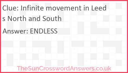 Infinite movement in Leeds North and South is a crossword clue for which we have 1 possible answer and we have spotted 3 times in our database. This crossword clue was last seen on 13 November 2022 in The Sun Cryptic Crossword puzzle!
