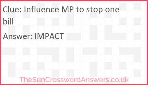 Influence MP to stop one bill is a crossword clue for which we have 1 possible answer and we have spotted 6 times in our database. This crossword clue was last seen on 25 January 2025 in The Sun Cryptic Crossword puzzle!