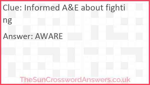 Informed A&E about fighting is a crossword clue for which we have 1 possible answer and we have spotted 4 times in our database. This crossword clue was last seen on 16 October 2024 in The Sun Cryptic Crossword puzzle!