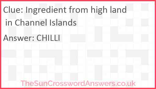 Ingredient from high land in Channel Islands is a crossword clue for which we have 1 possible answer and we have spotted 2 times in our database. This crossword clue was last seen on 20 October 2023 in The Sun Cryptic Crossword puzzle!